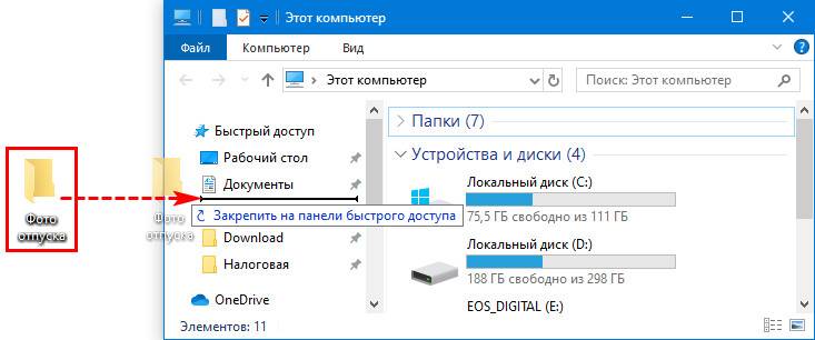 Есть еще один способ добавления объектов в панель, просто откройте проводник с нужными папками, перетащите при помощи мышки из правого окна в левый столбец панели нужные директории.