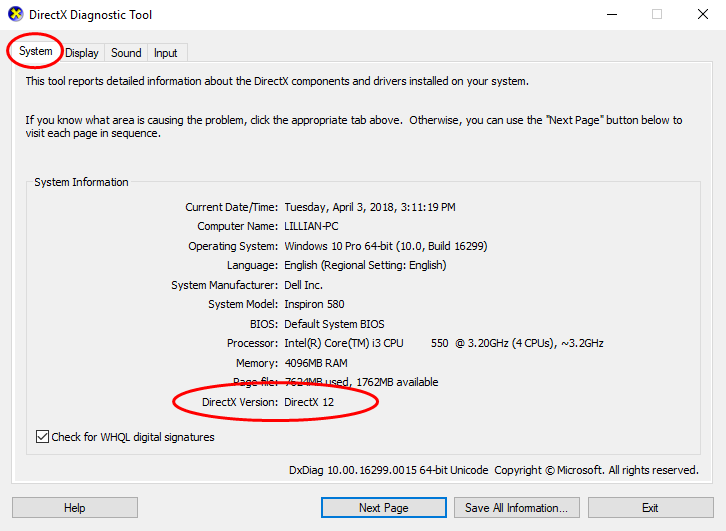 3) Вы можете увидеть DirectX Версия под система Вкладка.