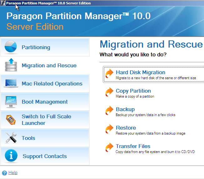 Что же касается функций управления разделами, то Paragon Partition Manager позволяет их создавать, удалять, делить, копировать, восстанавливать, объединять, делать их резервные копии и переносить на внешние носители. Можно даже перенести на другой все содержимое жесткого диска. Кроме перечисленного, приложение имеет сетевые функции, дающие возможность создать соединение с другими компьютерами локальной сети.