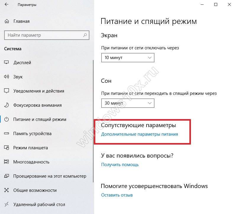 - с правой стороны отображается меню «Дополнительные параметры питания»;