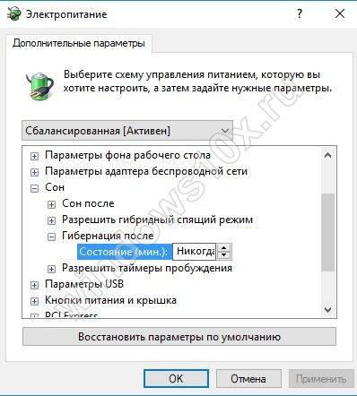 - в категории «Гибернация» после должно стоять значение «Никогда»;