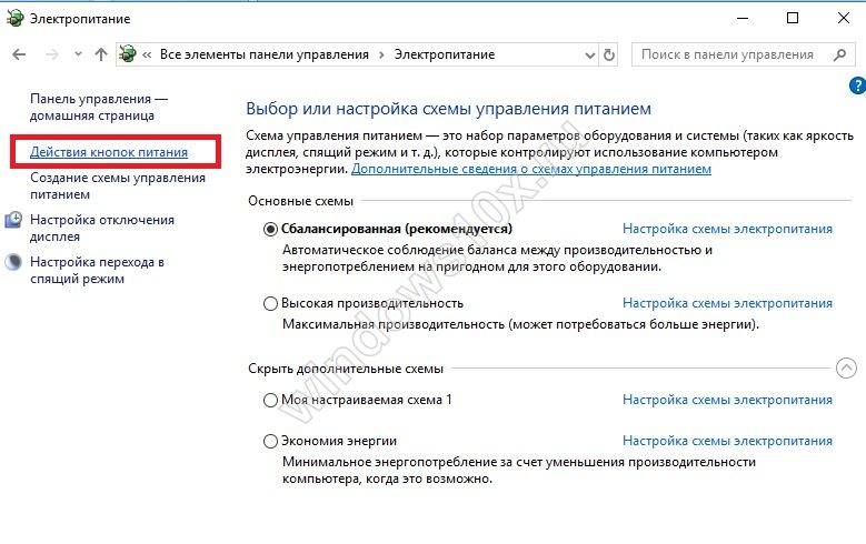 Далее в левой части экрана необходимо выбрать вкладку «Действия кнопок питания»;