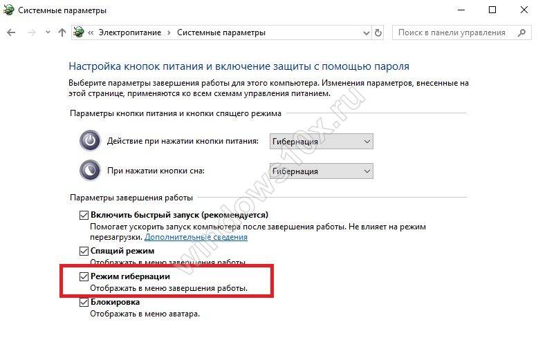 При нажатии на эту кнопку, в нижней части окна активируются ранее недоступные пункты, и среди них необходимо напротив «Режим гибернации» поставить галку, после чего нажать «Сохранить изменения».. Сразу после описанных выше действий, режим гибернации станет доступен в меню «Пуск», и им можно будет воспользоваться. Стоит отметить, что имеются ограничения со стороны «железа» на использование режима гибернации