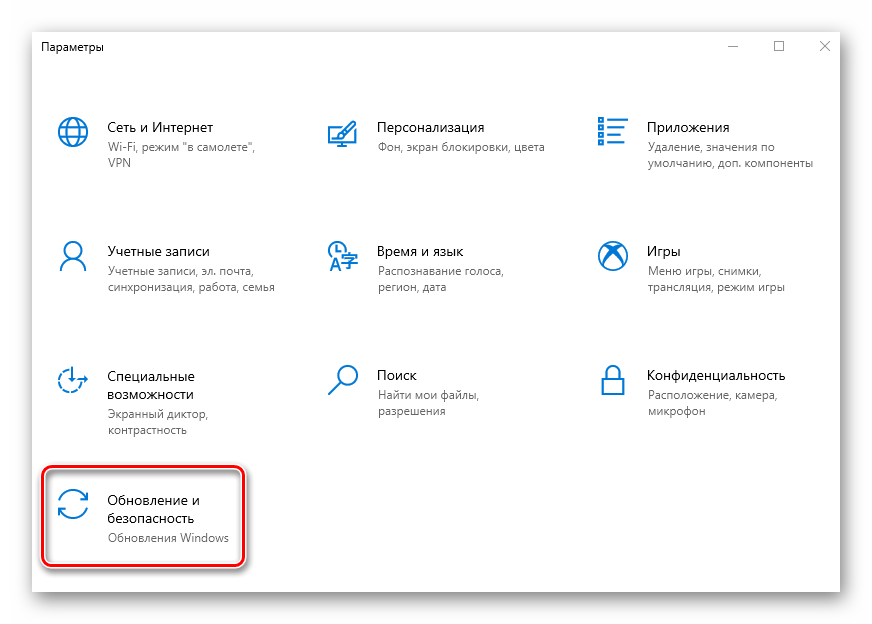 - Разверните окно «Параметры» путем нажатия комбинации клавиш «Win+I». Из него перейдите в категорию «Обновление и безопасность».