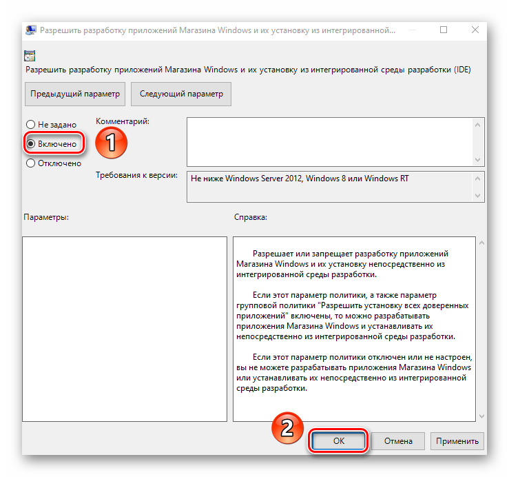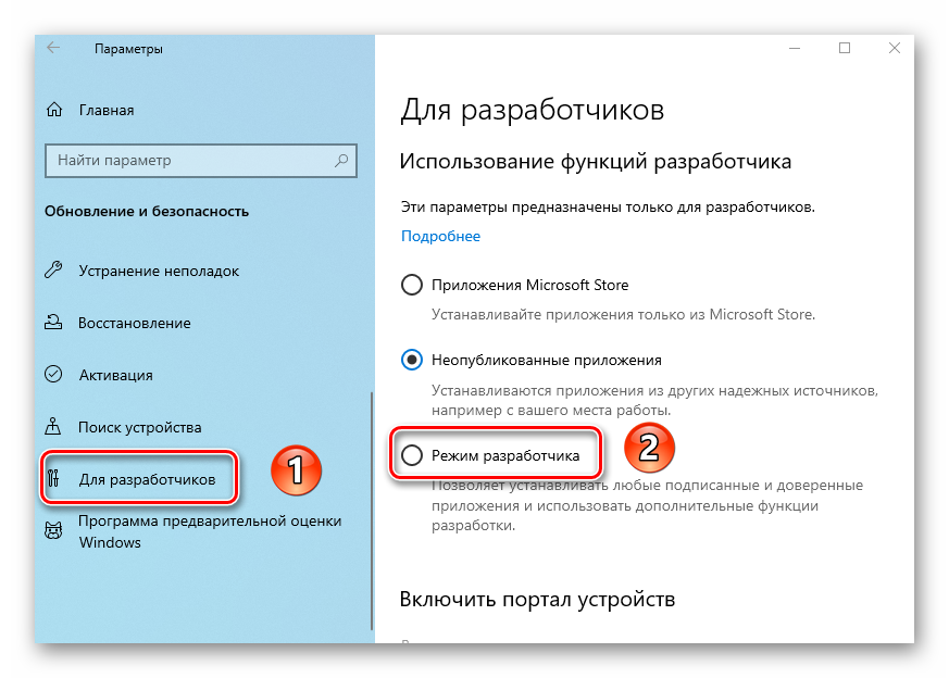 - Разрешить разработку приложений UWP и их установку из интегрированной среды разработки (IDE) .Allows development of UWP apps and installing them from an integrated development environment (IDE)