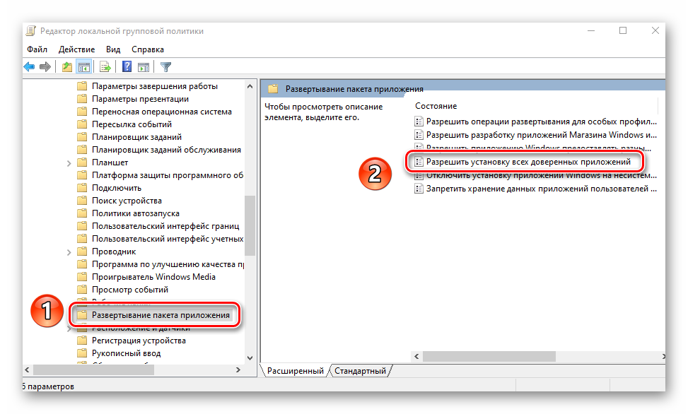 Аналогичным образом следует «включить» файл «Разрешить установку всех доверенных приложений» из того же списка.</li>