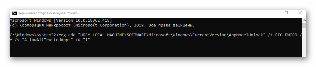 PS C:\\WINDOWS\\system32> reg add «HKEY\_LOCAL\_MACHINE\\SOFTWARE\\Microsoft\\Windows\\CurrentVersion\\AppModelUnlock» /t REG\_DWORD /f /v «AllowDevelopmentWithoutDevLicense» /d «1»
