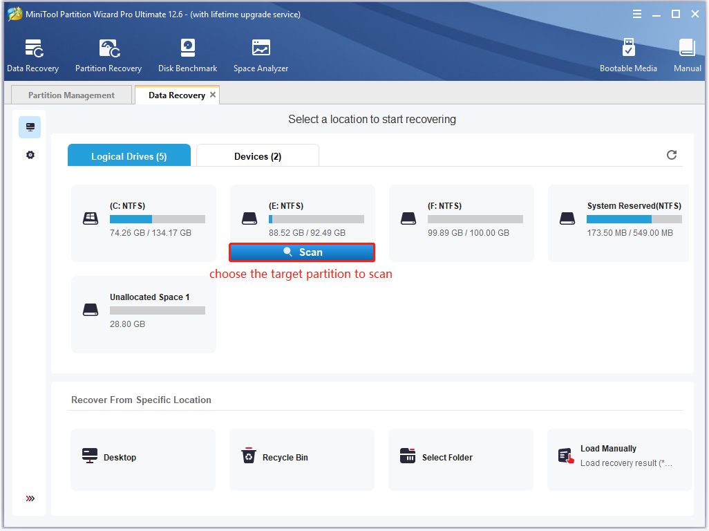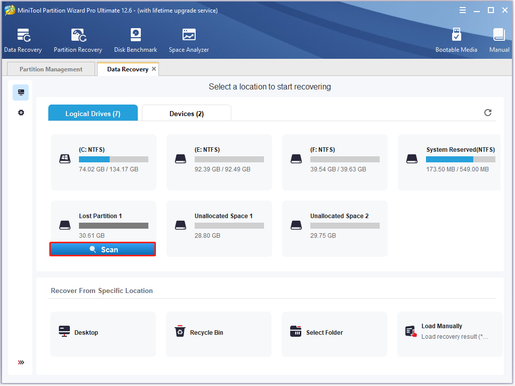 If found, just select the lost drive to scan. If not, please click the Devices tab, and choose the whole hard disk to scan: