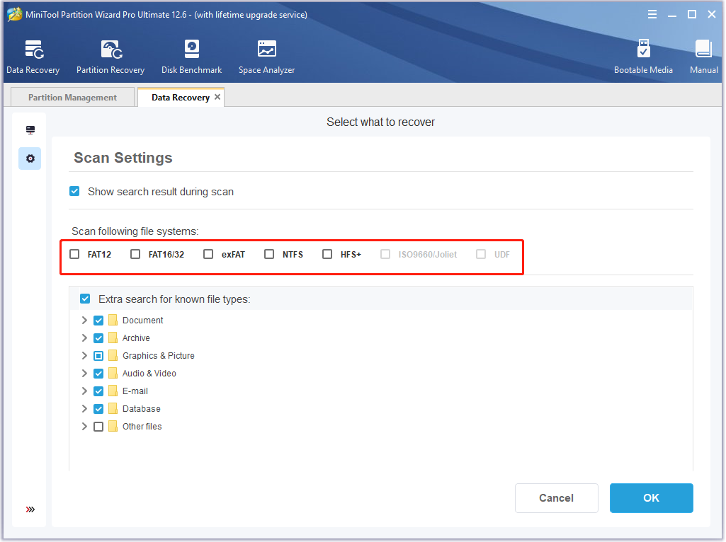 To perform a RAW scan, please run Data Recovery, find the existing partition/lost partition/unallocated space to be recovered, and go to Settings. Then uncheck all the file systems before scanning the desired.