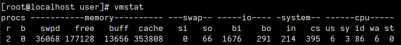 Значения каждой колонки:Procsr: количество запущенных процессов (работающих или ожидающих выполнения).b: количество спящих процессов.Memoryswpd: объем используемой виртуальной памяти.free: объем свободной памяти.buff: количество памяти, используемой в качестве буферов.cache: объем памяти, используемой в качестве кеша.inact: количество неактивной памяти (опция -a).active: количество активной памяти. (опция -a)Swapsi: объем памяти, выгруженный с диска (/s).so: объем памяти, перенесенный на диск (/s).IObi: блоки, полученные от блочного устройства (blocks/s).bo: блоки, отправленные на блочное устройство (blocks/s).Systemin: количество прерываний в секунду, включая часы.cs: количество переключений контекста в секунду.CPU