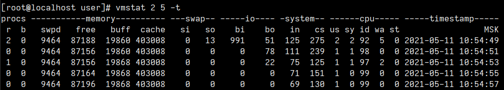 vmstat выполнен 5 раз с интервалом в 2 секунды.